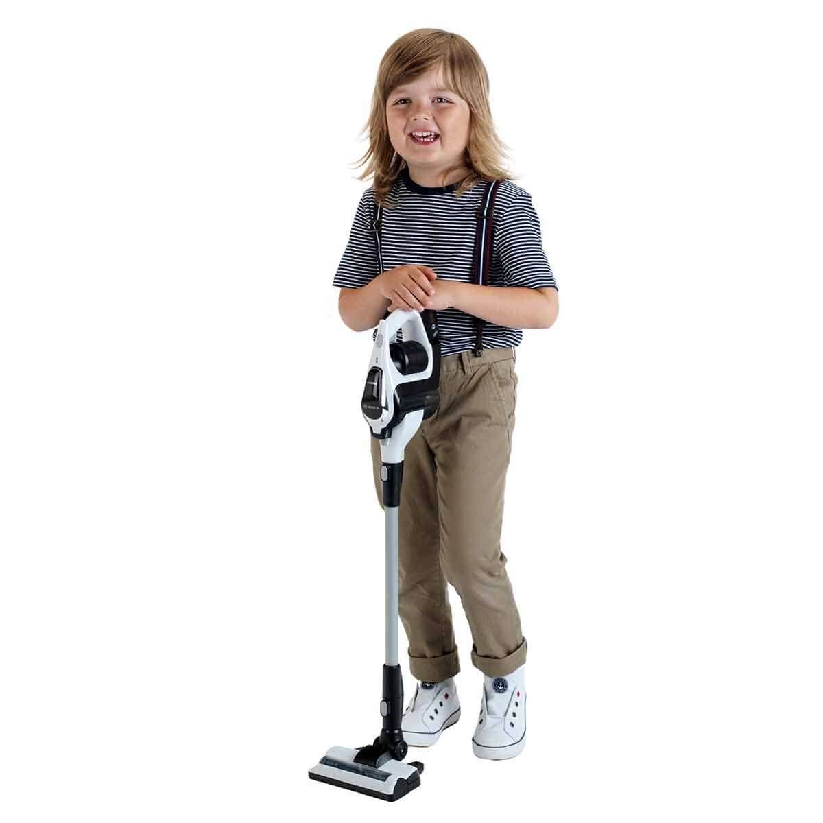 Orijinal Bosch şarjlı dikey süpürgeden esinlenerek yapılmış bu oyuncak süpürge; pratik kullanımı ve kuvvetli çekim gücüyle çocuklara oyun oynarken gerçek bir temizlik deneyimi yaşatacak.